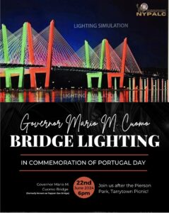 Also in New York City, to honor June as Portuguese Heritage Month, the Governor Mario M. Cuomo Bridge Lighting, will take place on June 22nd, at 6:00 pm, as part of the celebrations of Portugal Day. The public is invited to participate.